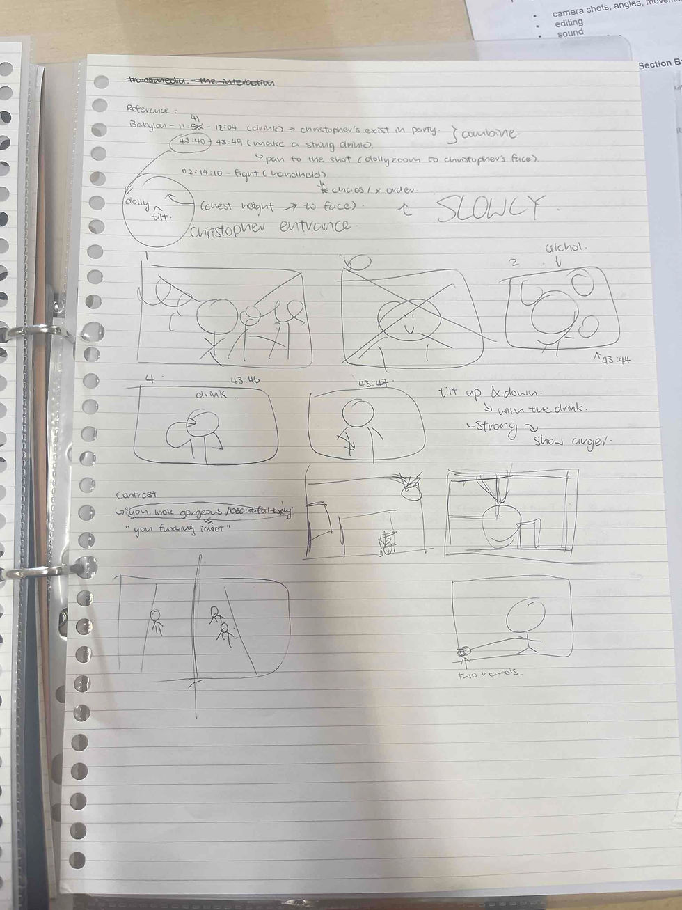 The feedback we got from our teacher and classmates is we need to make sure the story could fit into a two minutes film opening, and it needs to be an opening, not a full story. Second is the casting, because we decided to have a party scene, it’s hard to gather many people at the same time. Our teacher also suggested some films that we could research: Cruel Intention and Spring to mind. Moreover, we also need to consider how we could present the character Christopher as an abusive person through clear scenes and patterns of behaviors- how has he done that?